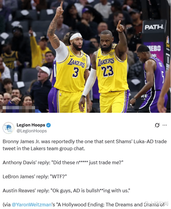 北京时间 10 月 22 日,据《纽约邮报》记者 Yaron Weitzman 报道,上赛季交易截止日前那个震惊全世界的夜晚,当勒布朗 - 詹姆斯得知安东尼 - 戴维斯被交易的消息时,他在湖人群聊中只发送了三个字母的简短信息:"WTF"(What TheFuck)。这一细节来自 NBA 记者亚伦 - 魏茨曼的新书《好莱坞结局:勒布朗湖人的梦想与戏剧》,为我们还原了那个改变联盟格局的历史性时刻。